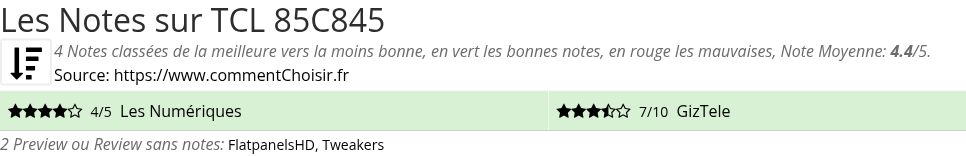 Les notes des sites et magazines internet peuvent etre peut-etre biaisés, au moins avec les avis client et des utilisateurs qui ont acheté TCL 85C845 sur amazon ou la fnac, on est sur d'avoir de vrais critiques sur ce produit. (les liens vers les magasins sont sponsorisés).