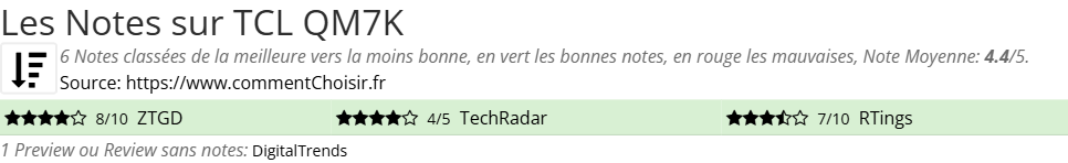Les notes des sites et magazines internet peuvent etre peut-etre biaisés, au moins avec les avis client et des utilisateurs qui ont acheté TCL QM7K sur amazon ou la fnac, on est sur d'avoir de vrais critiques sur ce produit. (les liens vers les magasins sont sponsorisés). Pour les jeux et quand cela est est possible nous listons aussi les notes moyennes sur les plateformes de consommateurs (comme IGDB)