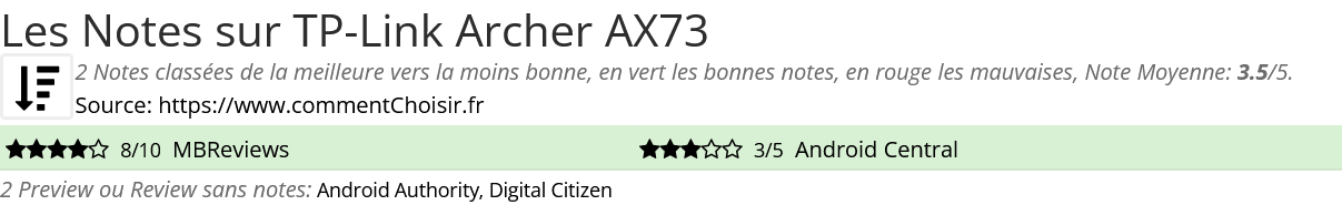 Les notes des sites et magazines internet peuvent etre peut-etre biaisés, au moins avec les avis client et des utilisateurs qui ont acheté TP-Link Archer AX73 sur amazon ou la fnac, on est sur d'avoir de vrais critiques sur ce produit. (les liens vers les magasins sont sponsorisés).