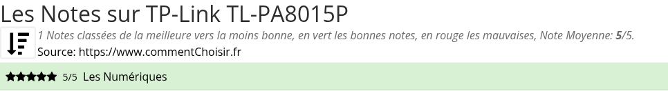 Les notes des sites et magazines internet peuvent etre peut-etre biaisés, au moins avec les avis client et des utilisateurs qui ont acheté TP-Link TL-PA8015P sur amazon ou la fnac, on est sur d'avoir de vrais critiques sur ce produit. (les liens vers les magasins sont sponsorisés).
