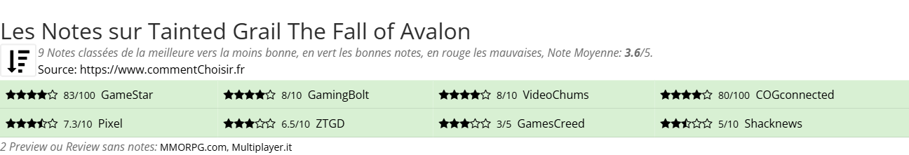 Les notes des sites et magazines internet peuvent etre peut-etre biaisés, au moins avec les avis client et des utilisateurs qui ont acheté Tainted Grail The Fall of Avalon sur amazon ou la fnac, on est sur d'avoir de vrais critiques sur ce produit. (les liens vers les magasins sont sponsorisés). Pour les jeux et quand cela est est possible nous listons aussi les notes moyennes sur les plateformes de consommateurs (comme IGDB)