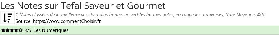 Voici tous les 1 avis et les tests que nous avons trouvé sur le Cuisine Tefal Saveur et Gourmet avec les 1 notes et les commentaires des testeurs dans leur review.