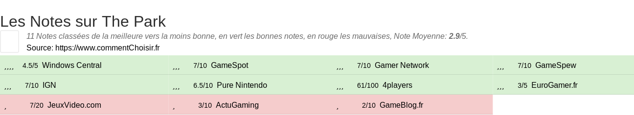 Parmis ces tests des sites & magazines internet spécialisés dans les Jeux, 11 ont donné une note et on obtient une note moyenne de 2.8/5 pour ce produit de The Park.