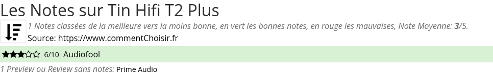 Parmis ces tests des sites & magazines internet spécialisés dans les Casque, 1 ont donné une note et on obtient une note moyenne de 3/5 pour ce produit de Tin Hifi.