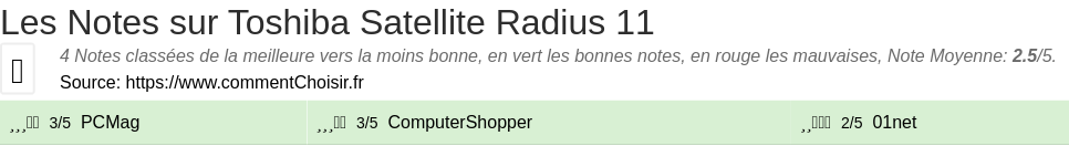 Parmis ces tests des sites & magazines internet spécialisés dans les Ordinateurs Portables, 4 ont donné une note et on obtient une note moyenne de 2.5/5 pour ce produit de Toshiba.