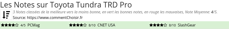 Les notes des sites et magazines internet peuvent etre peut-etre biaisés, au moins avec les avis client et des utilisateurs qui ont acheté Toyota Tundra TRD Pro sur amazon ou la fnac, on est sur d'avoir de vrais critiques sur ce produit. (les liens vers les magasins sont sponsorisés).