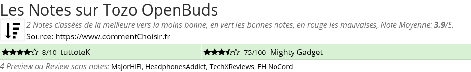 Les notes des sites et magazines internet peuvent etre peut-etre biaisés, au moins avec les avis client et des utilisateurs qui ont acheté Tozo OpenBuds sur amazon ou la fnac, on est sur d'avoir de vrais critiques sur ce produit. (les liens vers les magasins sont sponsorisés).