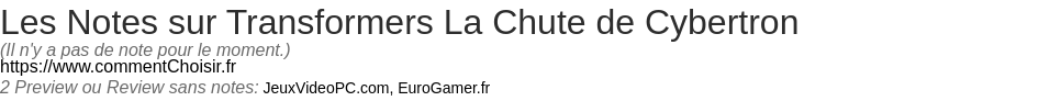 Les notes des sites et magazines internet peuvent etre peut-etre biaisés, au moins avec les avis client et des utilisateurs qui ont acheté Transformers La Chute de Cybertron sur amazon ou la fnac, on est sur d'avoir de vrais critiques sur ce produit. (les liens vers les magasins sont sponsorisés). Pour les jeux et quand cela est est possible nous listons aussi les notes moyennes sur les plateformes de consommateurs (comme IGDB)
