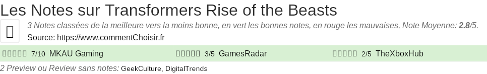 Les notes des sites et magazines internet peuvent etre peut-etre biaisés, au moins avec les avis client et des utilisateurs qui ont acheté Transformers Rise of the Beasts sur amazon ou la fnac, on est sur d'avoir de vrais critiques sur ce produit. (les liens vers les magasins sont sponsorisés). Pour les jeux et quand cela est est possible nous listons aussi les notes moyennes sur les plateformes de consommateurs (comme IGDB)