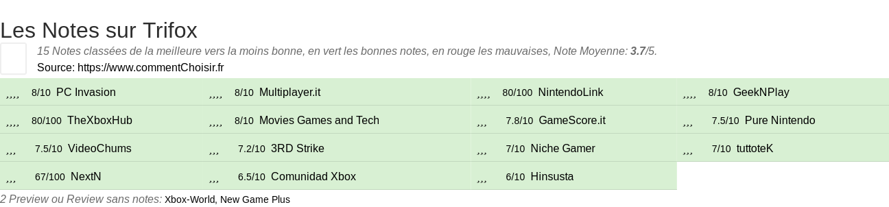 Les notes des sites et magazines internet peuvent etre peut-etre biaisés, au moins avec les avis client et des utilisateurs qui ont acheté Trifox sur amazon ou la fnac, on est sur d'avoir de vrais critiques sur ce produit. (les liens vers les magasins sont sponsorisés). Pour les jeux et quand cela est est possible nous listons aussi les notes moyennes sur les plateformes de consommateurs (comme IGDB)