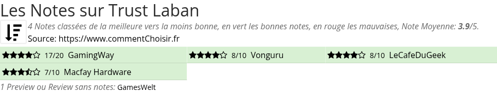 Les notes des sites et magazines internet peuvent etre peut-etre biaisés, au moins avec les avis client et des utilisateurs qui ont acheté Trust Laban sur amazon ou la fnac, on est sur d'avoir de vrais critiques sur ce produit. (les liens vers les magasins sont sponsorisés).