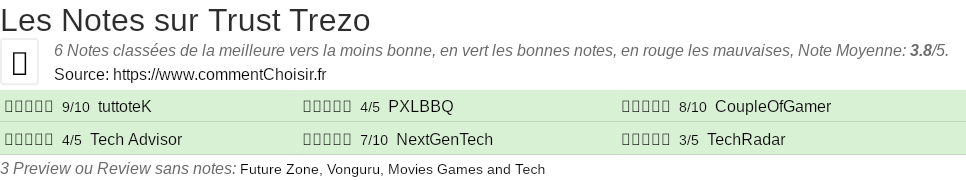 Les notes des sites et magazines internet peuvent etre peut-etre biaisés, au moins avec les avis client et des utilisateurs qui ont acheté Trust Trezo sur amazon ou la fnac, on est sur d'avoir de vrais critiques sur ce produit. (les liens vers les magasins sont sponsorisés).