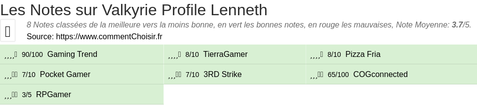 Les notes des sites et magazines internet peuvent etre peut-etre biaisés, au moins avec les avis client et des utilisateurs qui ont acheté Valkyrie Profile Lenneth sur amazon ou la fnac, on est sur d'avoir de vrais critiques sur ce produit. (les liens vers les magasins sont sponsorisés). Pour les jeux et quand cela est est possible nous listons aussi les notes moyennes sur les plateformes de consommateurs (comme IGDB) L'EAN du produit testé, son code barre, est le 5060121821811.