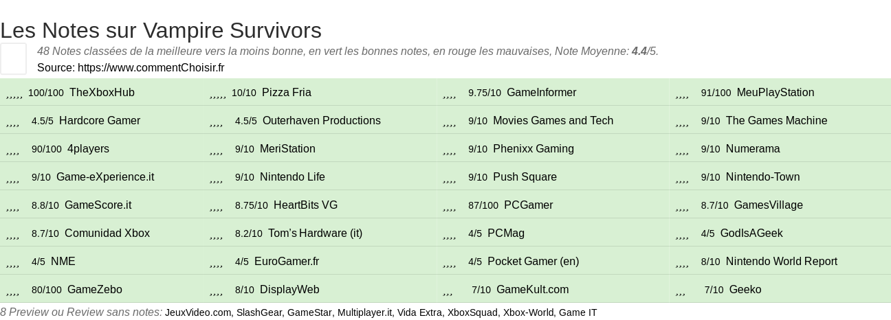 Les notes des sites et magazines internet peuvent etre peut-etre biaisés, au moins avec les avis client et des utilisateurs qui ont acheté Vampire Survivors sur amazon ou la fnac, on est sur d'avoir de vrais critiques sur ce produit. (les liens vers les magasins sont sponsorisés). Pour les jeux et quand cela est est possible nous listons aussi les notes moyennes sur les plateformes de consommateurs (comme IGDB)