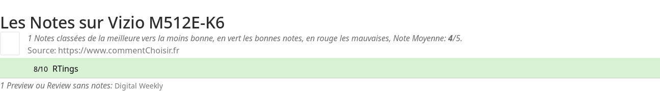Les notes des sites et magazines internet peuvent etre peut-etre biaisés, au moins avec les avis client et des utilisateurs qui ont acheté Vizio M512E-K6 sur amazon ou la fnac, on est sur d'avoir de vrais critiques sur ce produit. (les liens vers les magasins sont sponsorisés).