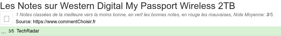 Parmis ces tests des sites & magazines internet spécialisés dans les Disque Dur, 1 ont donné une note et on obtient une note moyenne de 3/5 pour ce produit de Western Digital.