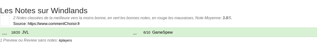 Parmis ces tests des sites & magazines internet spécialisés dans les Jeux, 2 ont donné une note et on obtient une note moyenne de 3.8/5 pour ce produit de Windlands.