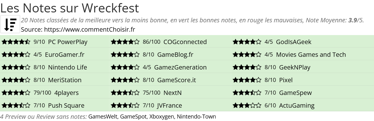 Parmis ces tests des sites & magazines internet spécialisés dans les Jeux, 20 ont donné une note et on obtient une note moyenne de 3.9/5 pour ce produit de Wreckfest.