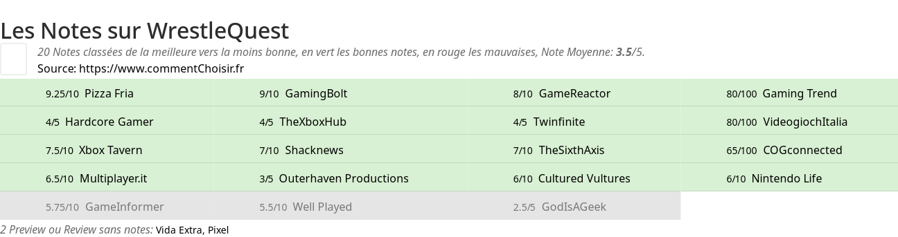 Les notes des sites et magazines internet peuvent etre peut-etre biaisés, au moins avec les avis client et des utilisateurs qui ont acheté WrestleQuest sur amazon ou la fnac, on est sur d'avoir de vrais critiques sur ce produit. (les liens vers les magasins sont sponsorisés). Pour les jeux et quand cela est est possible nous listons aussi les notes moyennes sur les plateformes de consommateurs (comme IGDB)