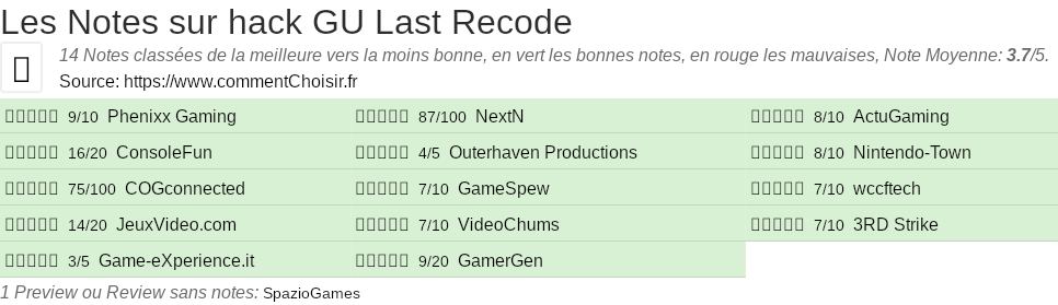 Les notes des sites et magazines internet peuvent etre peut-etre biaisés, au moins avec les avis client et des utilisateurs qui ont acheté hack GU Last Recode sur amazon ou la fnac, on est sur d'avoir de vrais critiques sur ce produit. (les liens vers les magasins sont sponsorisés). Pour les jeux et quand cela est est possible nous listons aussi les notes moyennes sur les plateformes de consommateurs (comme IGDB)